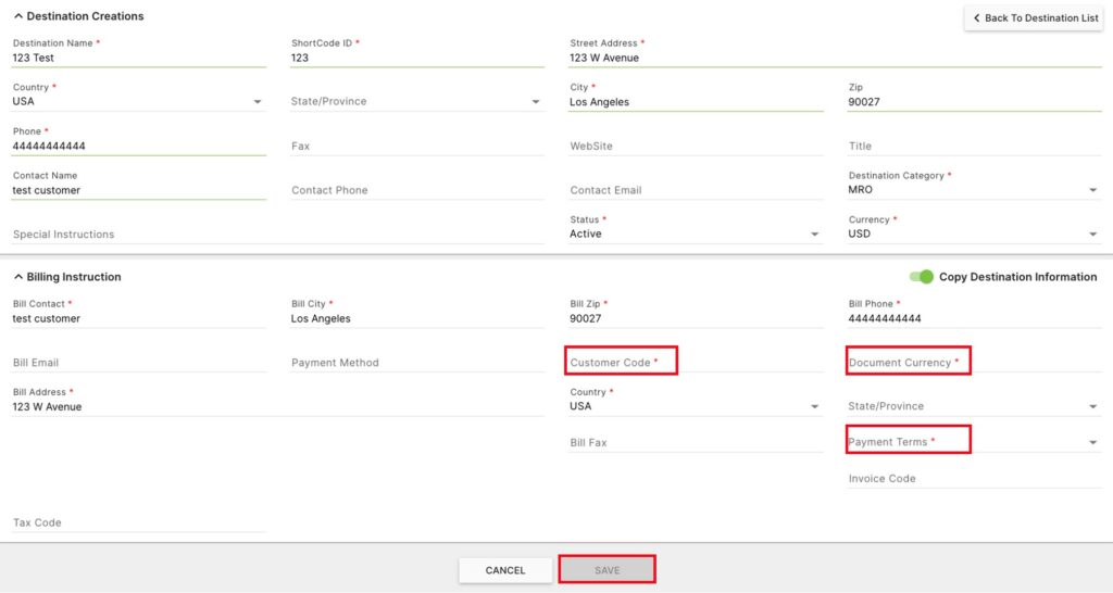 After the destination information has been copied in the Billing Instruction section, enter a Customer Code and Document Currency. Choose Payment Terms from the drop-down, and click Save.