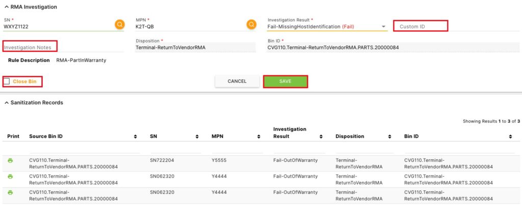 The Sanitization Records section at the bottom of the page will contain a list of the assets in the bin available for an RMA investigation. To edit one of those assets or add an asset to the bin, enter the SN and click the