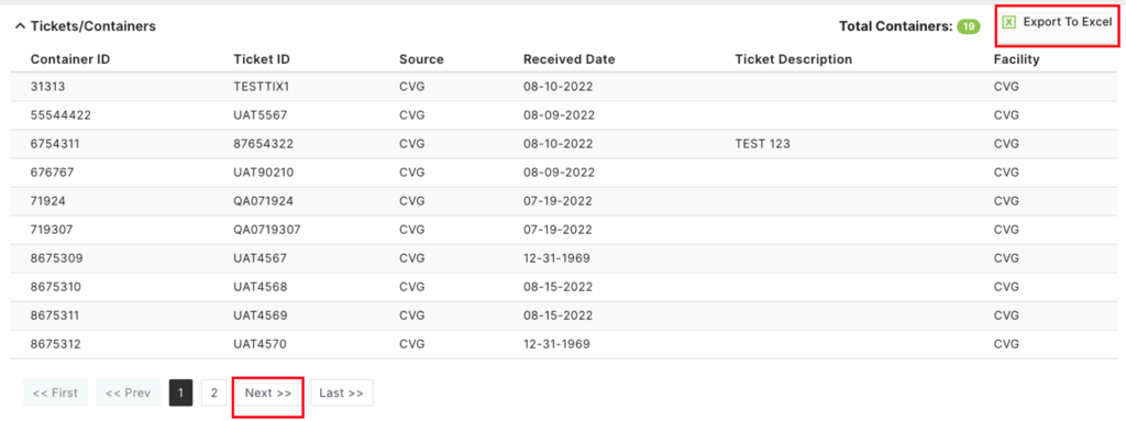 In the Add Attributes section, in the Ticket/Containers Search tab click on the image check box next to Received Date, Source, Ticket Description, Verified, or Facility to add this category to the Tickets/Containers Search results. Click Tickets/Containers Search to load the search results for tickets and containers.